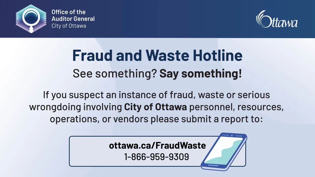 Today, the Office of the Auditor General of the City of Ottawa launched a new campaign to help raise awareness about the City's Fraud and Waste Hotline. The Hotline is an important tool that allows City employees and members of the public to confidentially and anonymously report suspected fraud, waste, or serious wrongdoing involving City personnel, resources, operations, or vendors. The Hotline helps strengthen the City’s commitment to honesty and integrity.